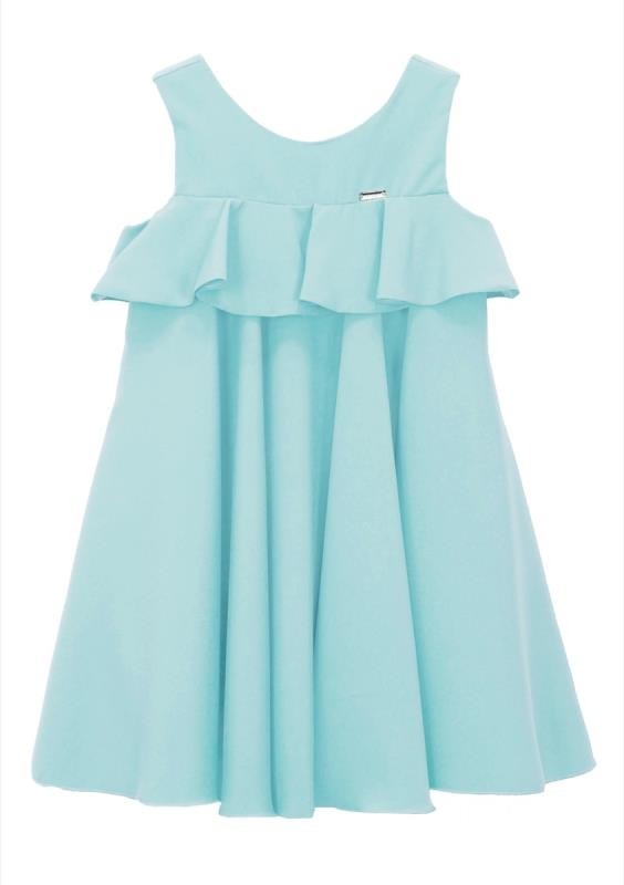 Vestido de ceremonia para niña confeccionado en satén liso de alta calidad, parte de la colección Amaya. Presenta un diseño elegante con tirantes y un volante capeado que se extiende desde el delantero hasta el centro de la espalda, disminuyendo gradualmente para aportar un efecto sofisticado y delicado. El vestido cuenta con un cuello redondo en el frente y un escote de pico en la espalda, que realzan la silueta infantil con sutileza. Incluye forro para mayor comodidad y caída perfectas.