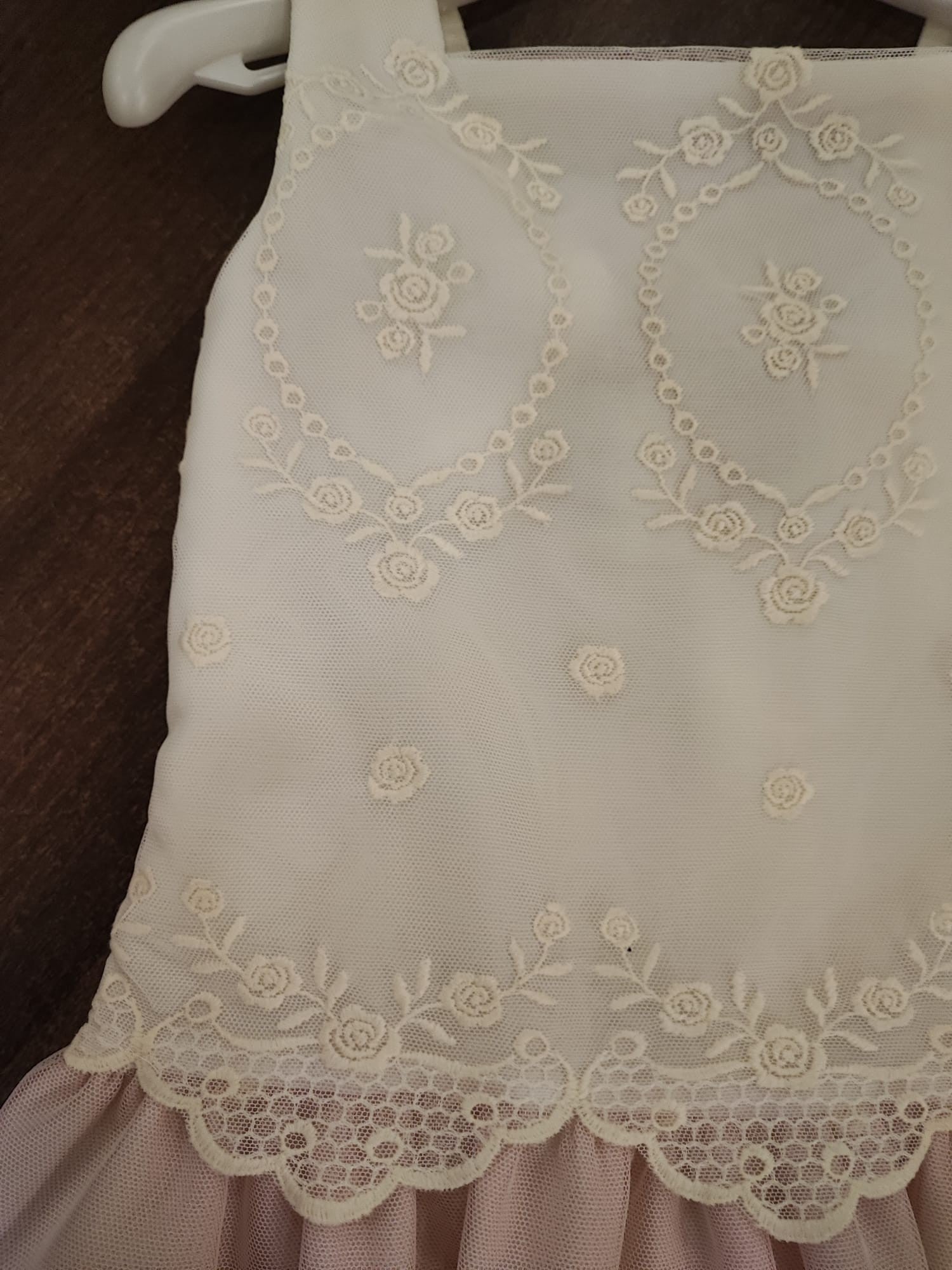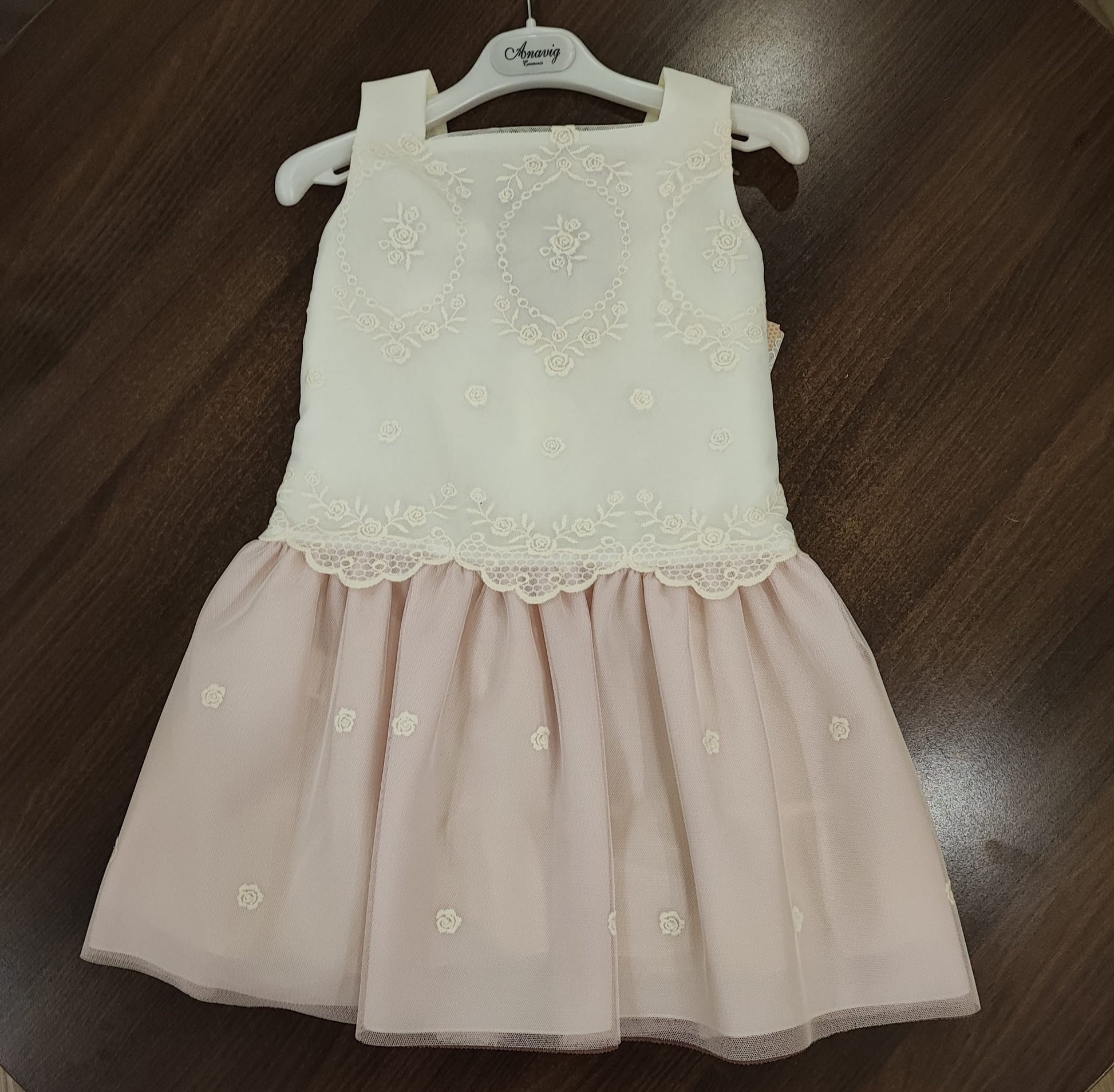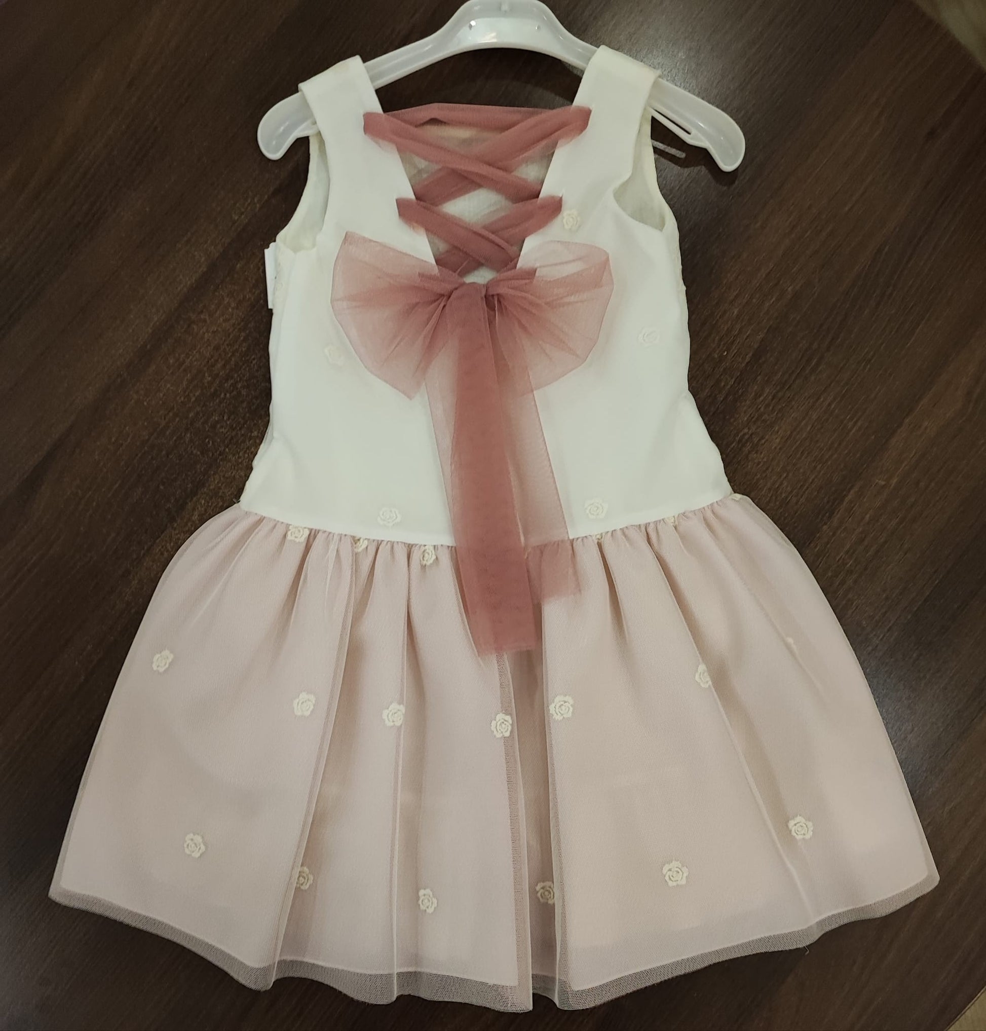 De corte a la cadera, con cuerpo en crudo y falda en tono rosa