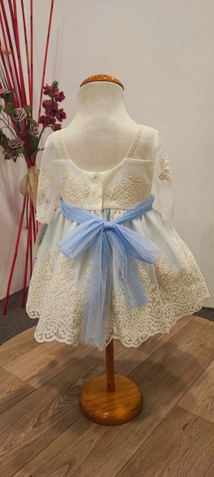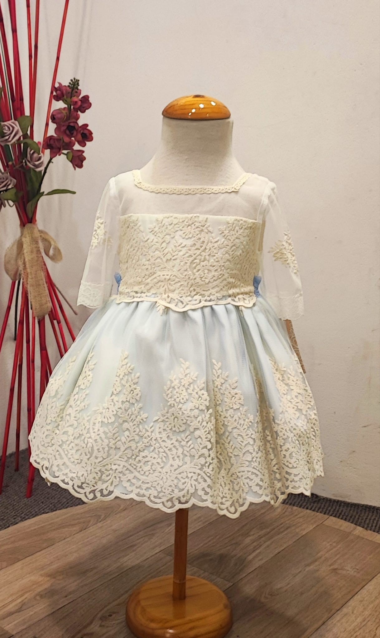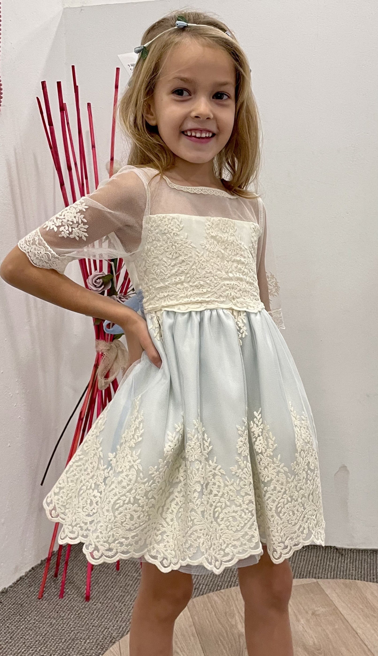 El cuerpo bordado con transparencias en el cuello, con manga al codo en tul con flores bordadas y la falda lleva una sobre falda.