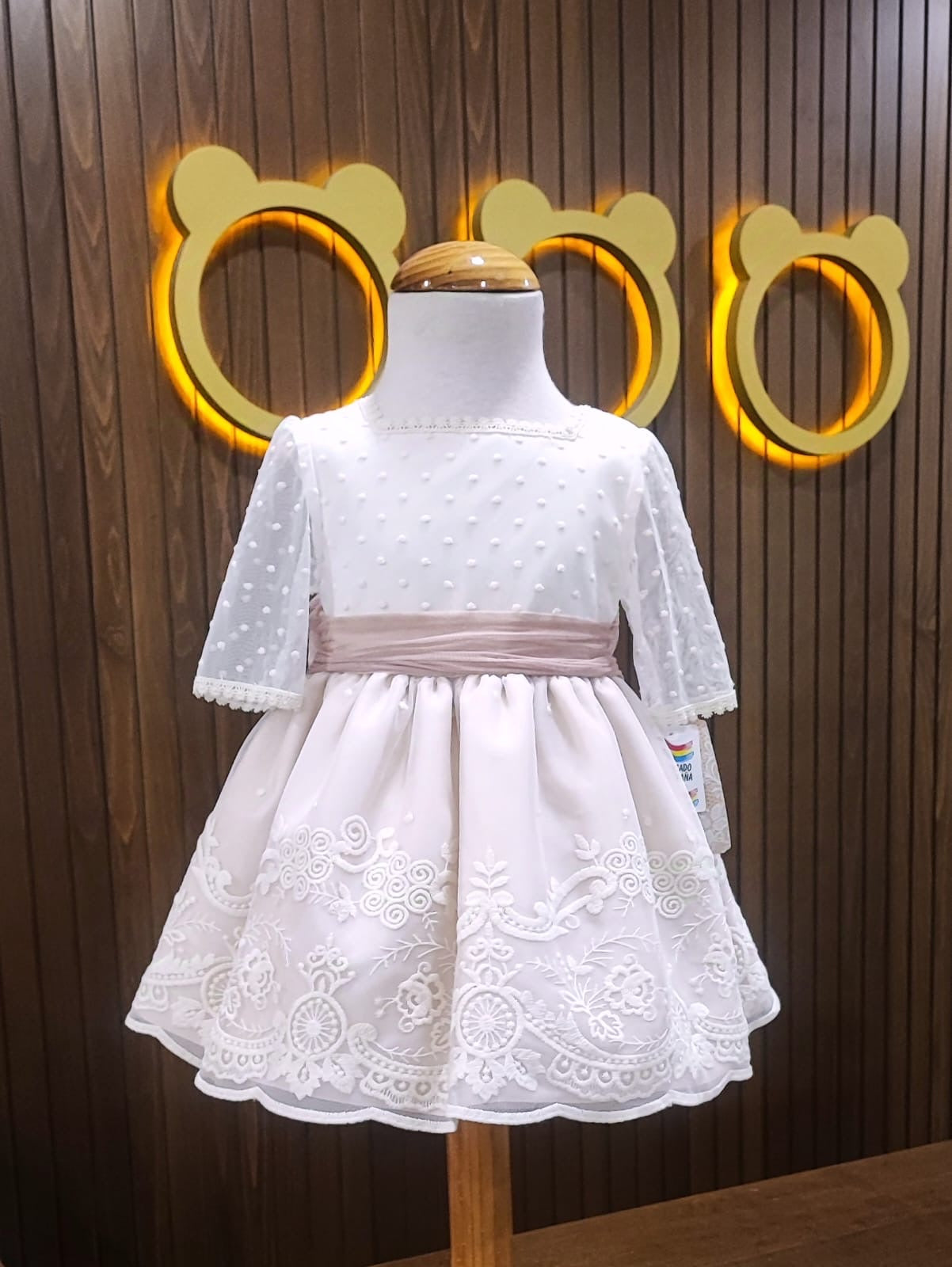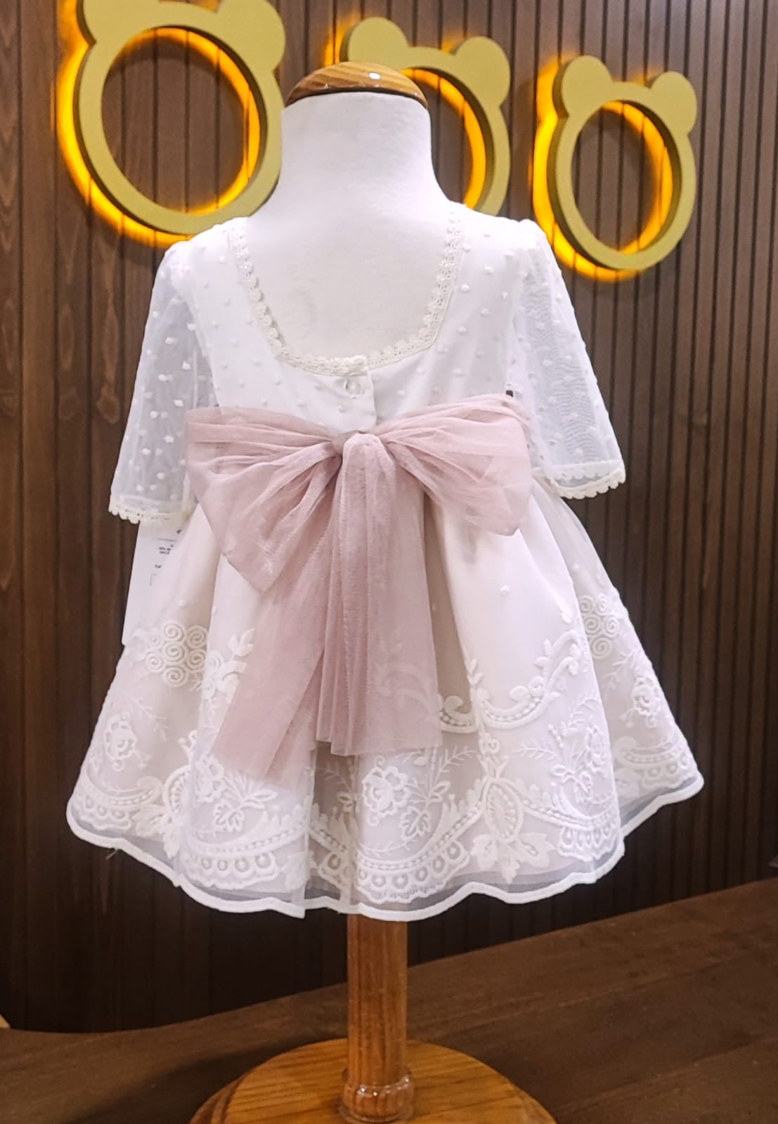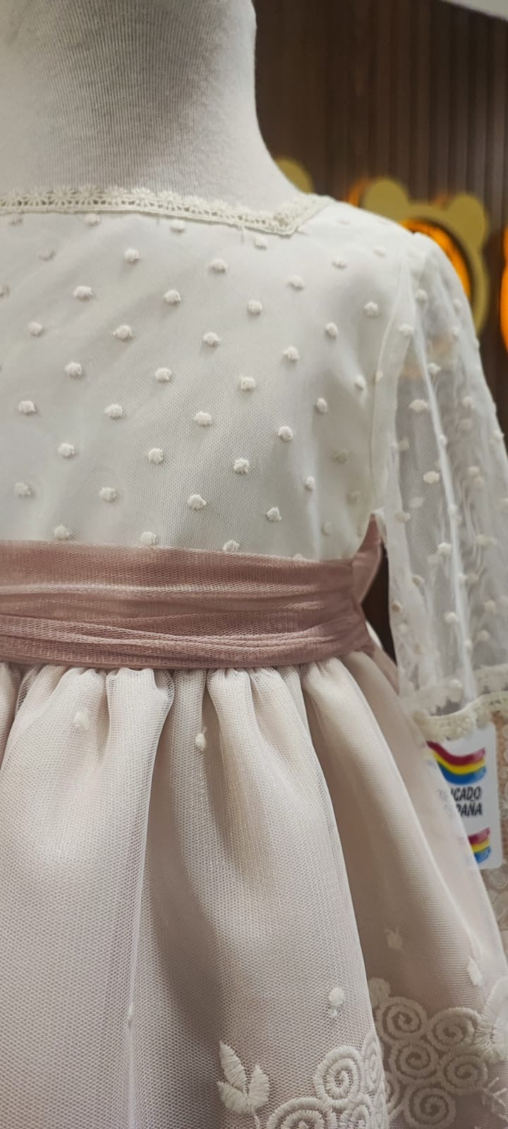 Vestido de ceremonia Anavig 1607, confeccionado en tul bordado con detalles en rosa maquillaje.