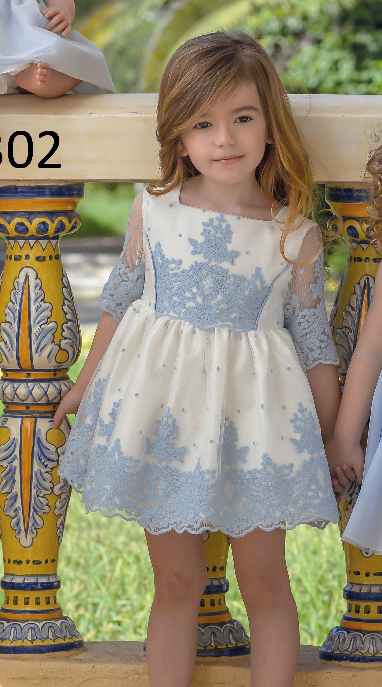 Vestido de ceremonia Anavig 1608, confeccionado en tul bordado con detalles en azul. Destaca por su falda y mangas francesas, además de abrirse por botones en la espalda. Perfecto para eventos especiales. Fabricado en España.
