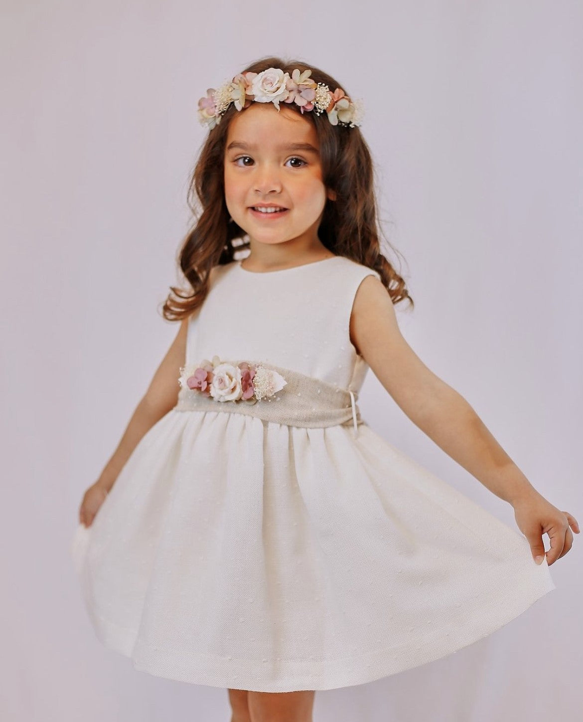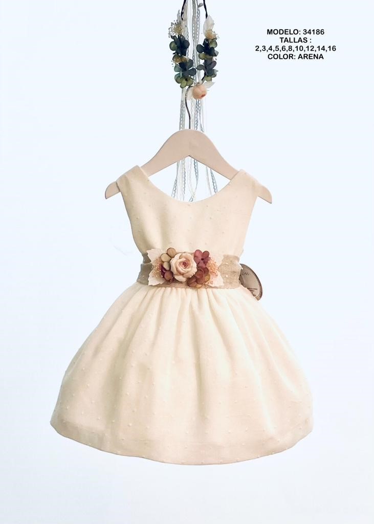 Sin mangas. El cuerpo en tejido de plumeti con fajín en tono tierra y flores en la cintura.