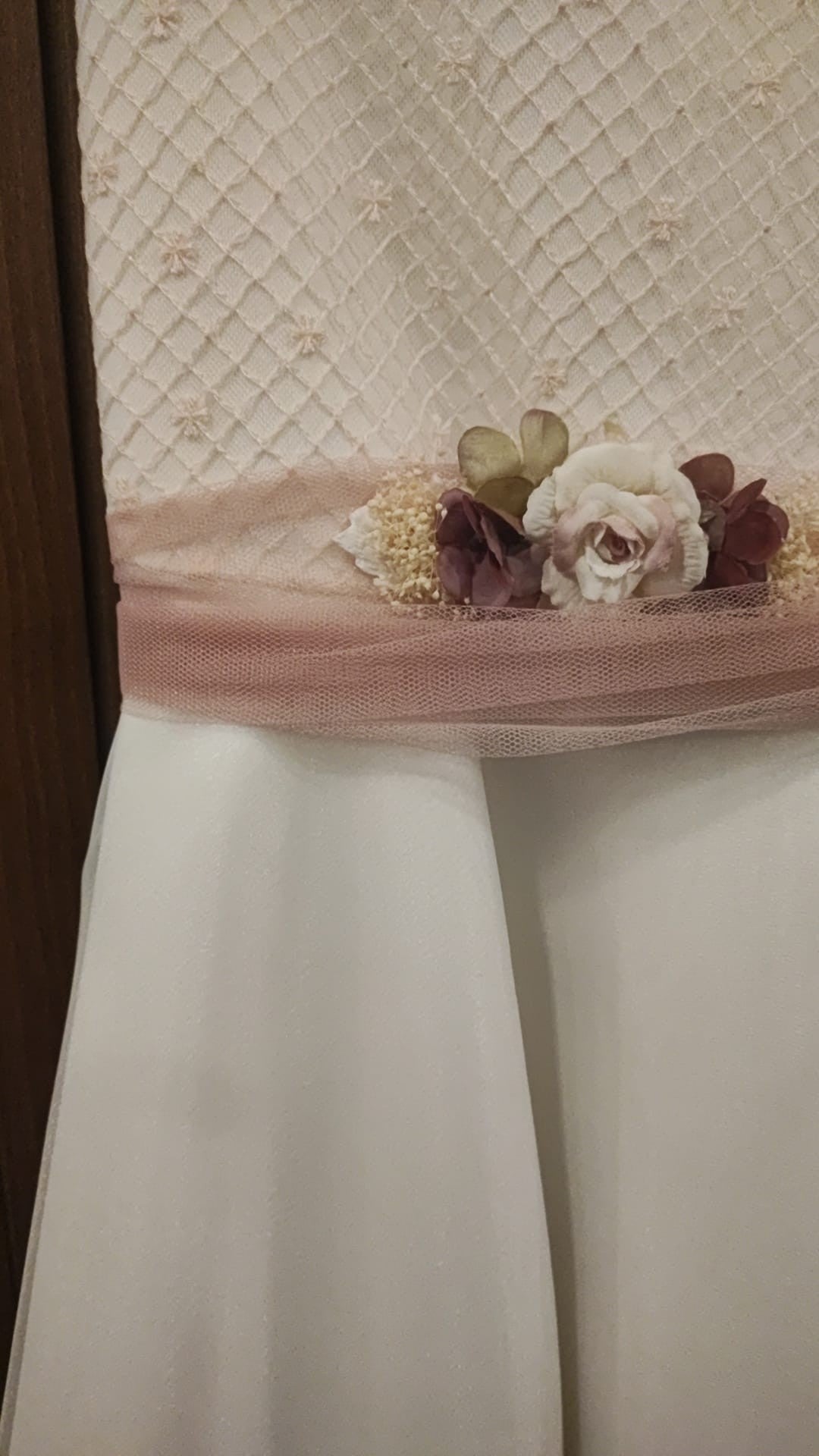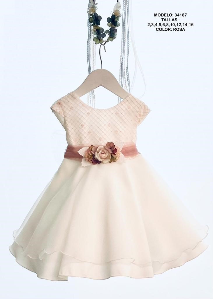 Manga corta y la falda de capa con fajín en tul que va en tono rosa palo.