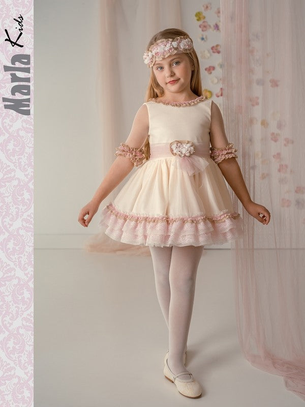 El Vestido Ceremonia M011 Marla es una pieza elegante diseñada para niñas acompañantes, confeccionada en tul plumeti con fondo beige que aporta suavidad y delicadeza. Sus mangas semitransparentes hasta el codo terminan en una sutil puntilla rizada color rosa, aportando un toque romántico y refinado. El cuerpo del vestido es liso para un acabado limpio, mientras que la falda, también en tul plumeti, culmina en ondas de puntilla rosa que realzan el movimiento y la gracia al andar.