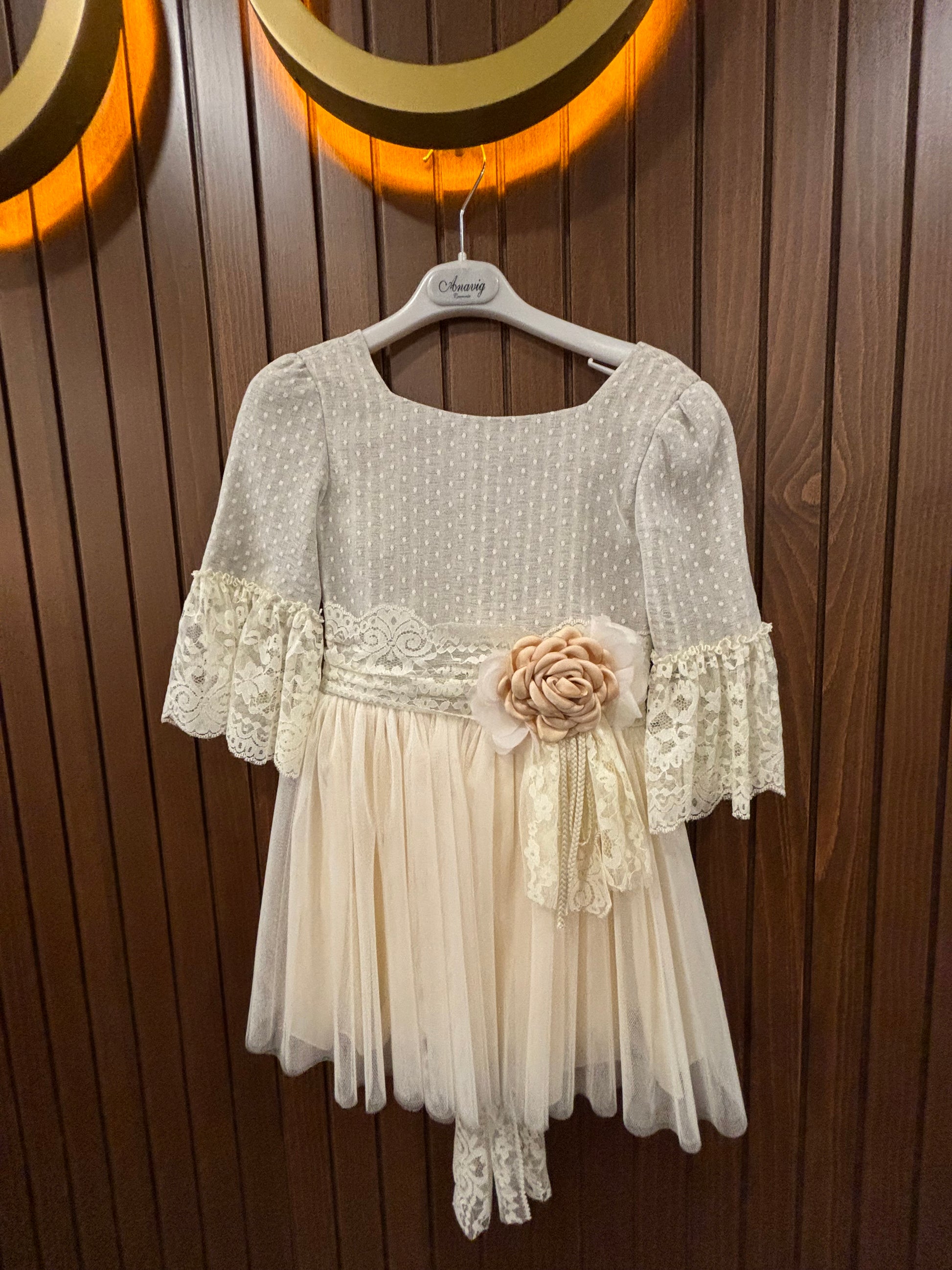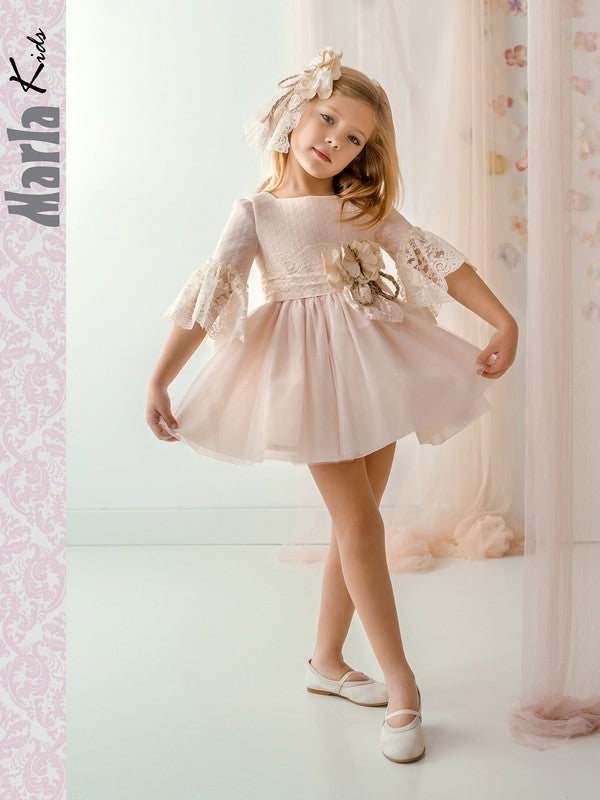 Espectacular vestido corto con manga realizado en tul plumeti de color rosa y detalles en tul rosa pastel con espectaculares flores en la cintura.