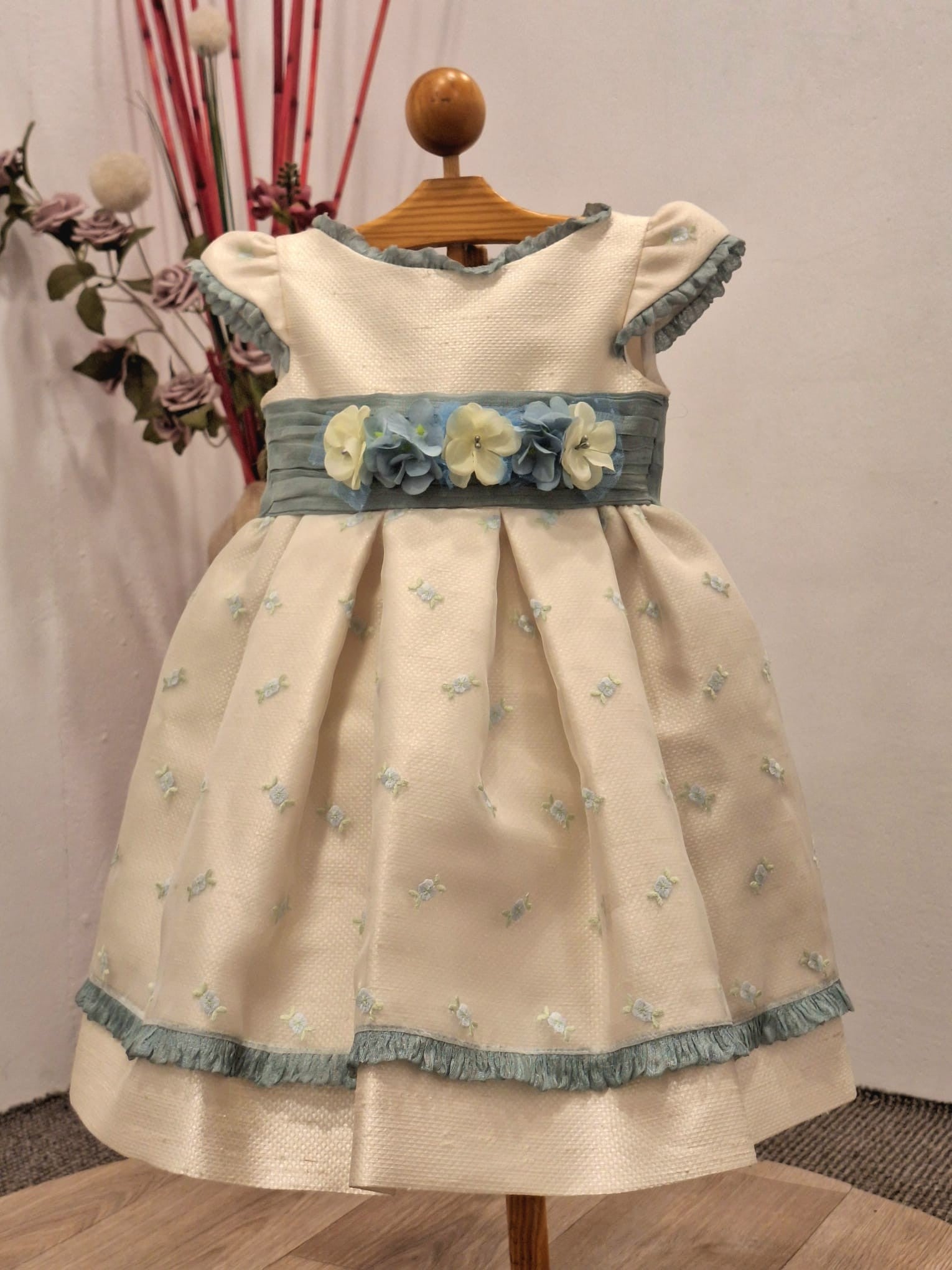 El cuerpo en seda en tono marfil con vivos en las mangas y cuello en verde agua. Fajín en el mismo tono con flores a juego.