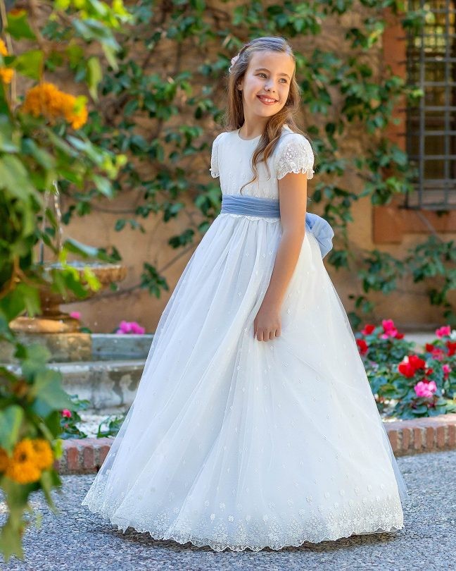 Un delicado modelo Aire Mini. Vestido de comunión de talle corto y estilo romántico, confeccionado en tul bordado. Presenta un escote redondo, una espalda en V, manga caída y un fajín de tul.