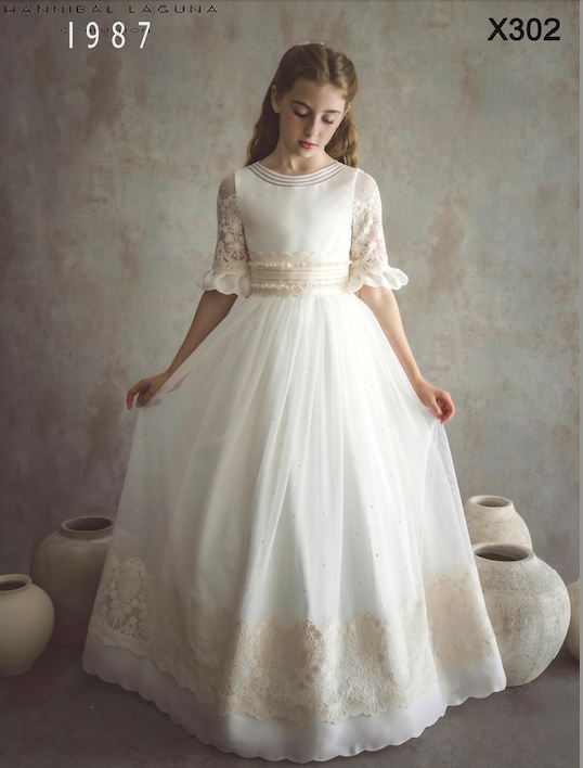 Elegante vestido de comunión PREMIUM de Hannibal Laguna realizado en seda combinada con tul. Bonito cuerpo liso decorado con fajín de jaretas, vanicas y puntillas de Seda al tono. Manga francesa en tul con dos volantes de seda decarada con puntillas y flores en tono rosa. Falda de seda con capa de tul de plumeti acabada en bonitas puntillas y jaretas con vainicas.