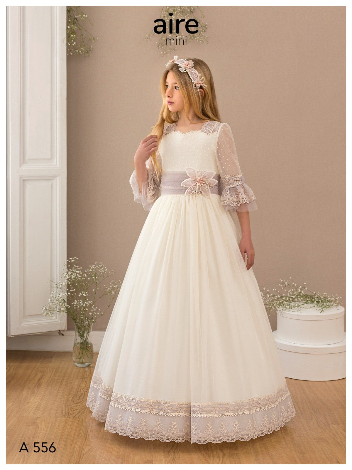 Vestido de comunión premium de la nueva colección de la firma Aire Barcelona Comunión realizado en tul bordado.
