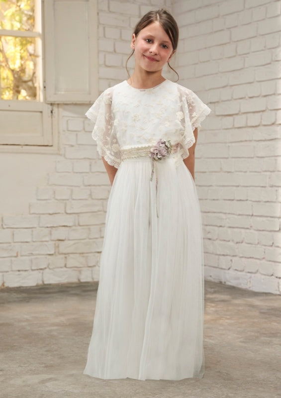 El Vestido Mono Comunión Convertible 2026 Amaya 636050 está elaborado en tul bordado de alta calidad, que aporta una textura suave y un acabado elegante perfecto para un evento tan significativo. Este conjunto versátil incluye tres piezas: una falda larga, un mono de tul sin mangas y una capa bordada removible, ofreciendo múltiples opciones para adaptar el look según la ocasión. La falda y el mono se combinan cómodamente, garantizando libertad de movimiento y una silueta sofisticada durante toda la ceremonia. La capa añade un toque refinado que puede retirarse para un estilo más sencillo, haciendo de este vestido una elección práctica y estilosa para el día de la comunión.