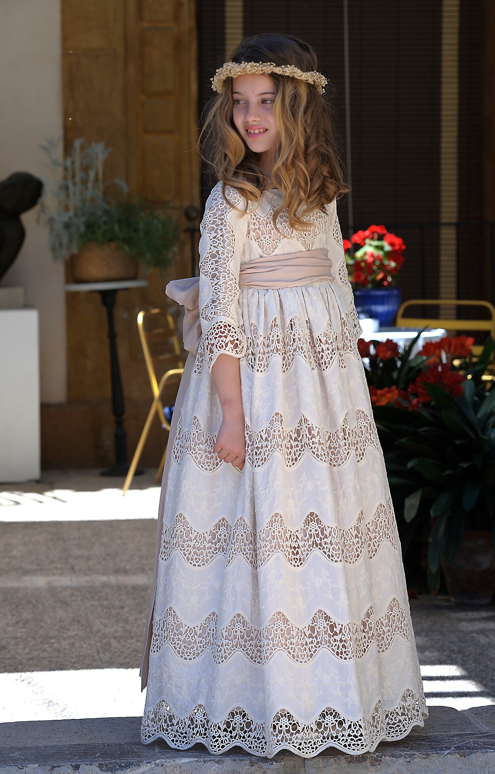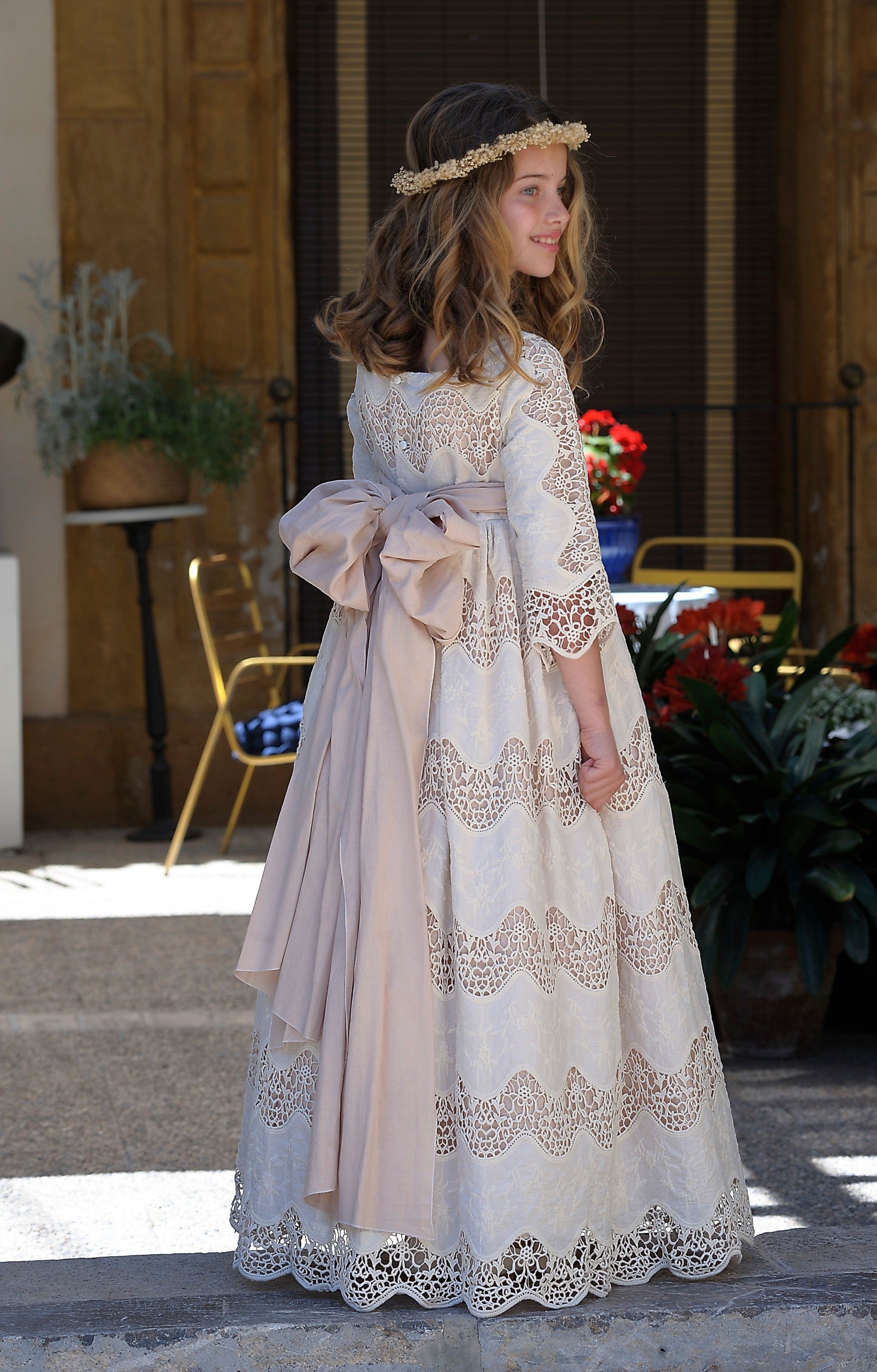 Espectacular y elegante vestido de comunión, realizado en batista perforada con fondo rosa palo.