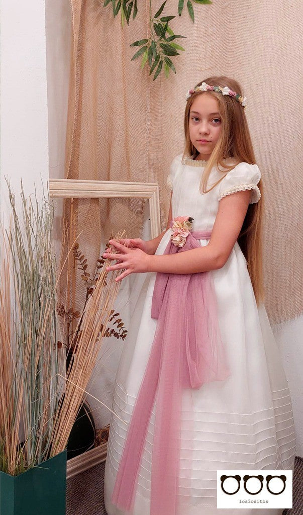 Espectacular y elegante vestido de comunión, realizado en esterilla de seda con fajín rosa palo.