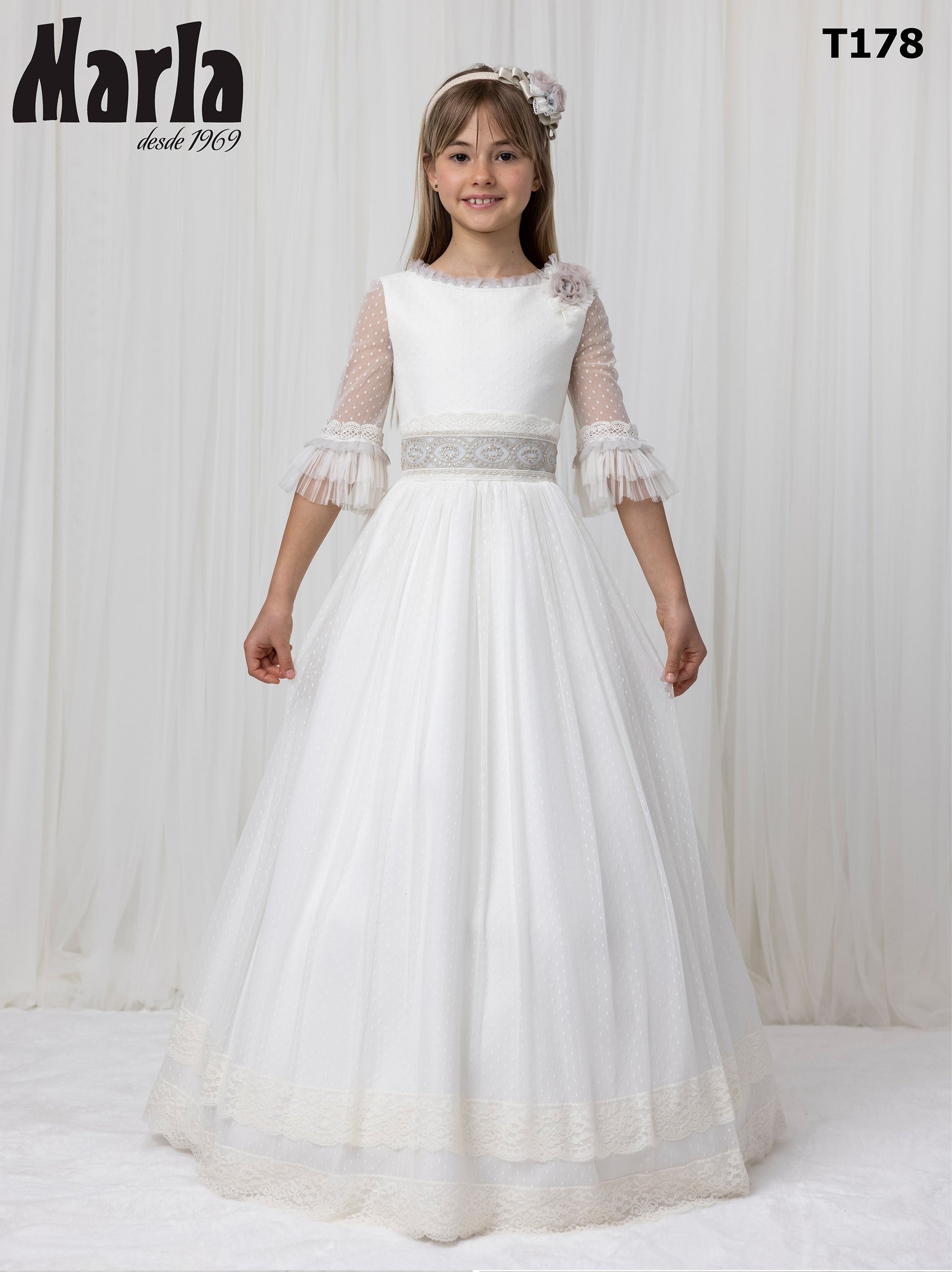 Espectacular y elegante vestido de comunión, realizado en tul de plumeti en color crudo.