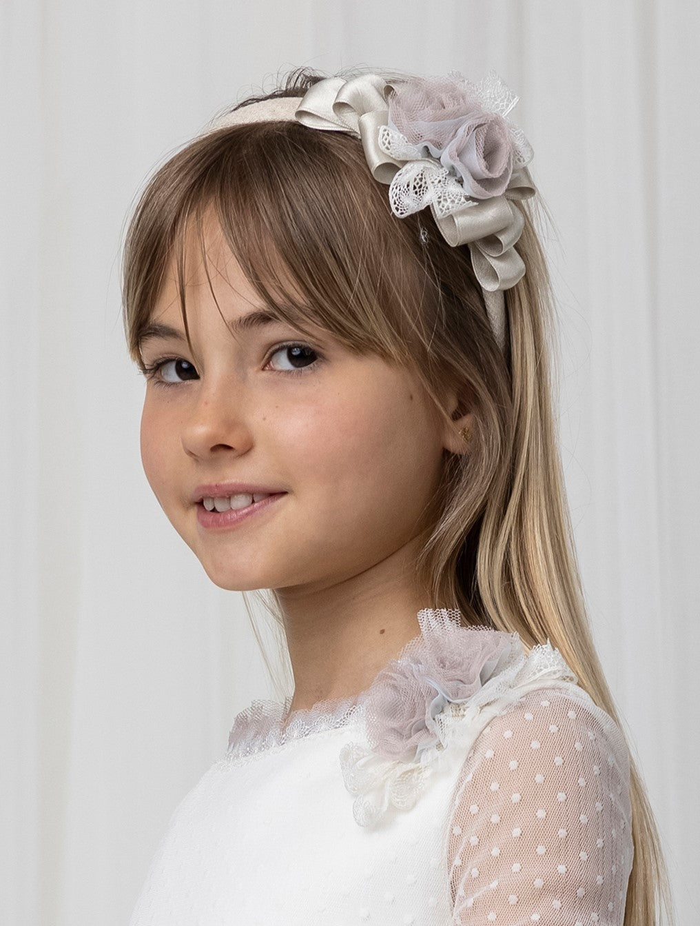 Este vestido lleva un precioso tocado de comunión a juego con el fajín del vestido que vendemos por separado.