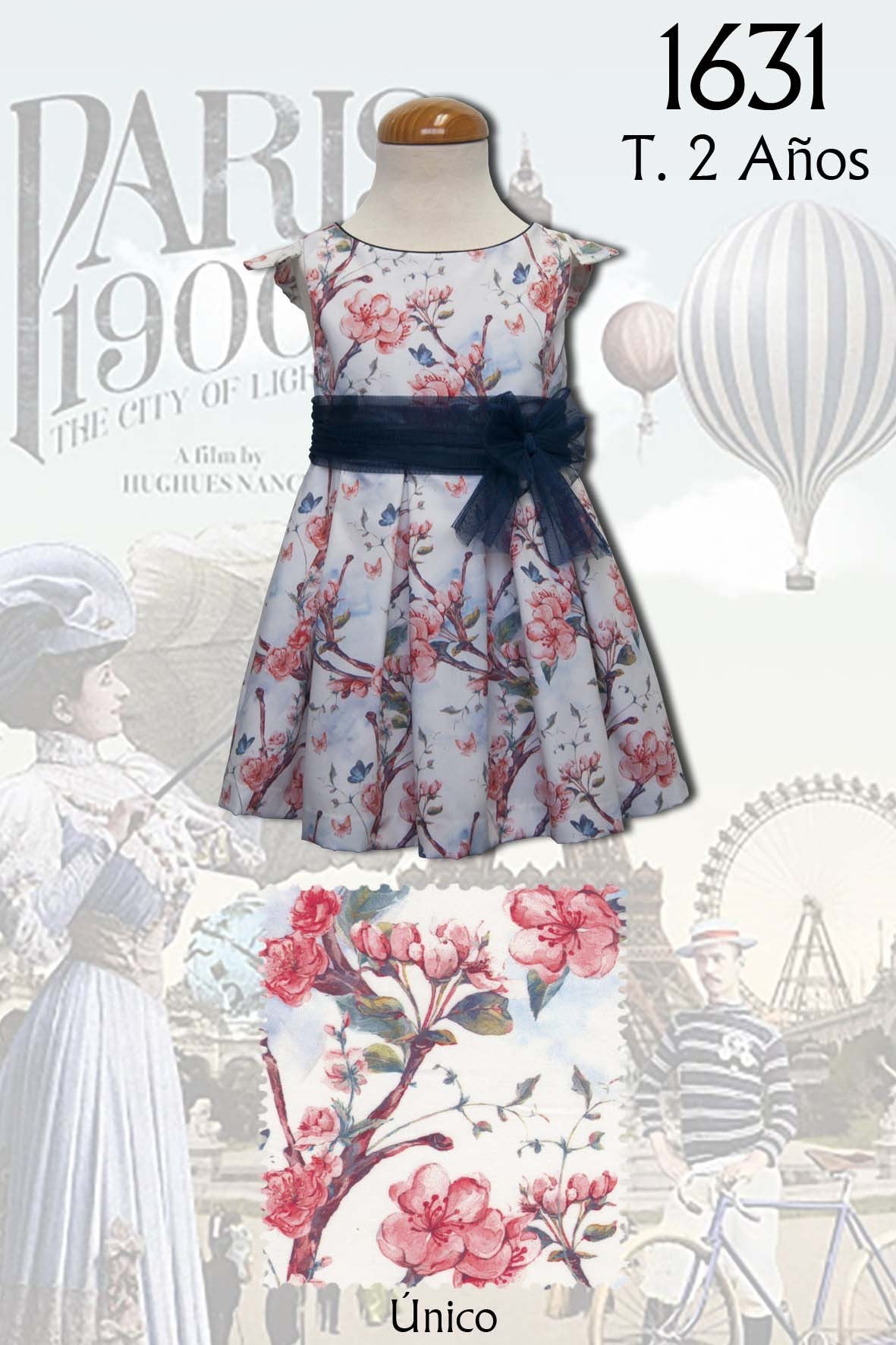 Vestido estampado de flores con bonito fajín en color azul marino.