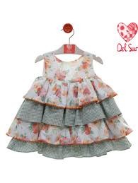 Vestido niña estampado con flores en tono verde y naranja con volantes en la falda.