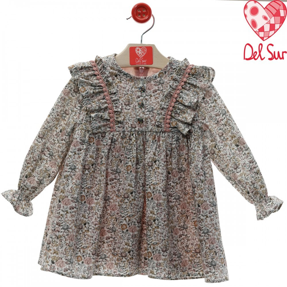 Vestido de maga larga con vuelo niña con print de flores rosa palo