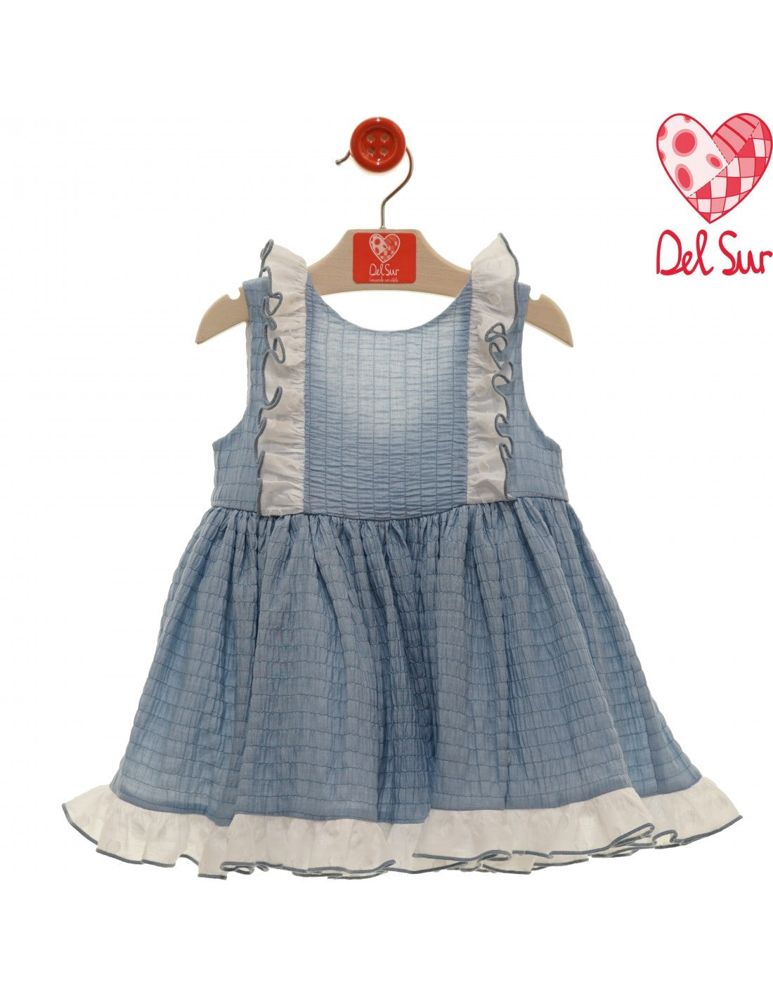 Vestido vuelo niña en tono azul empolvado con volantes en crudo.
