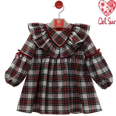 Vestido vuelo niña con print de cuadros rojos con volante en V en el pecho.