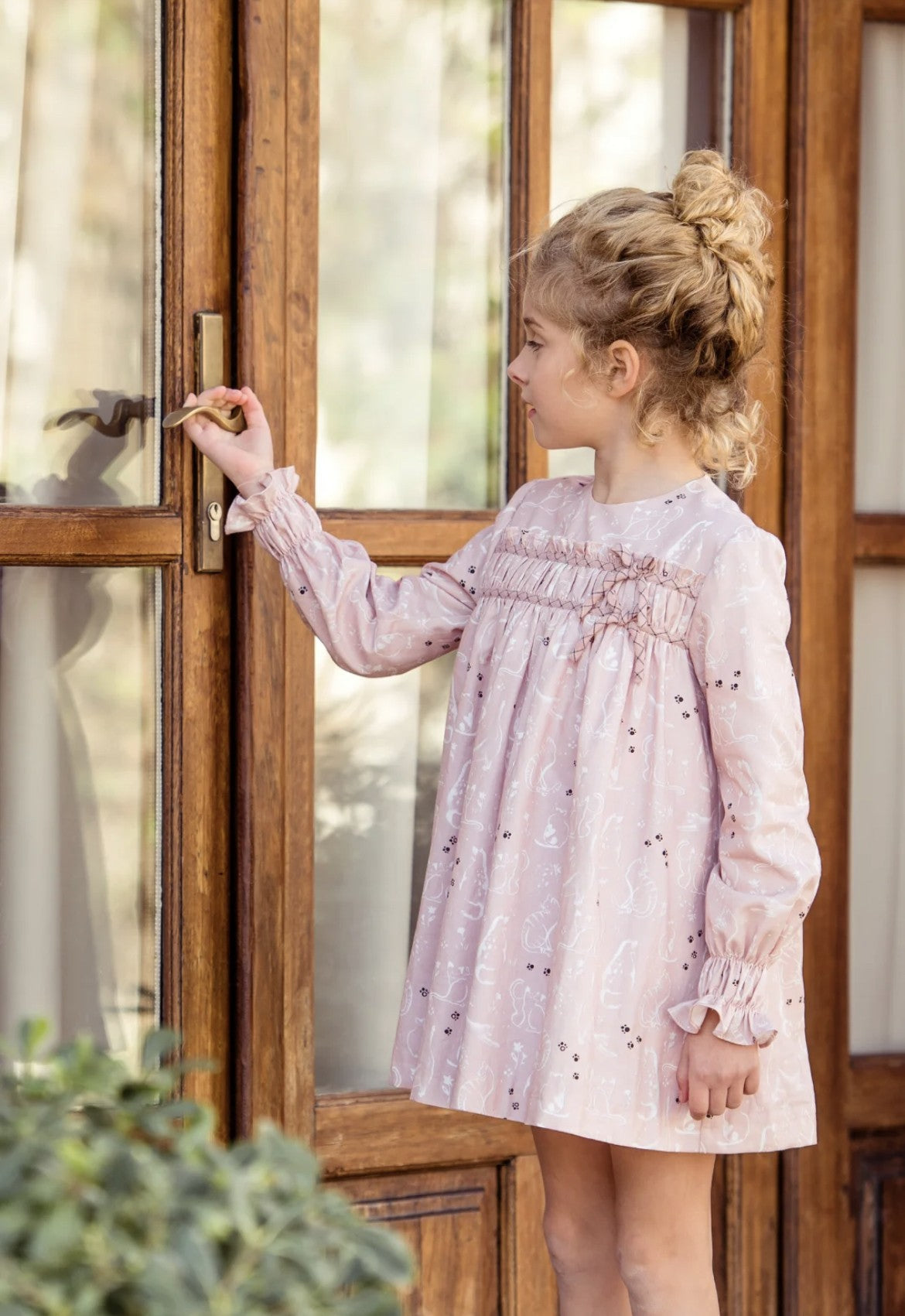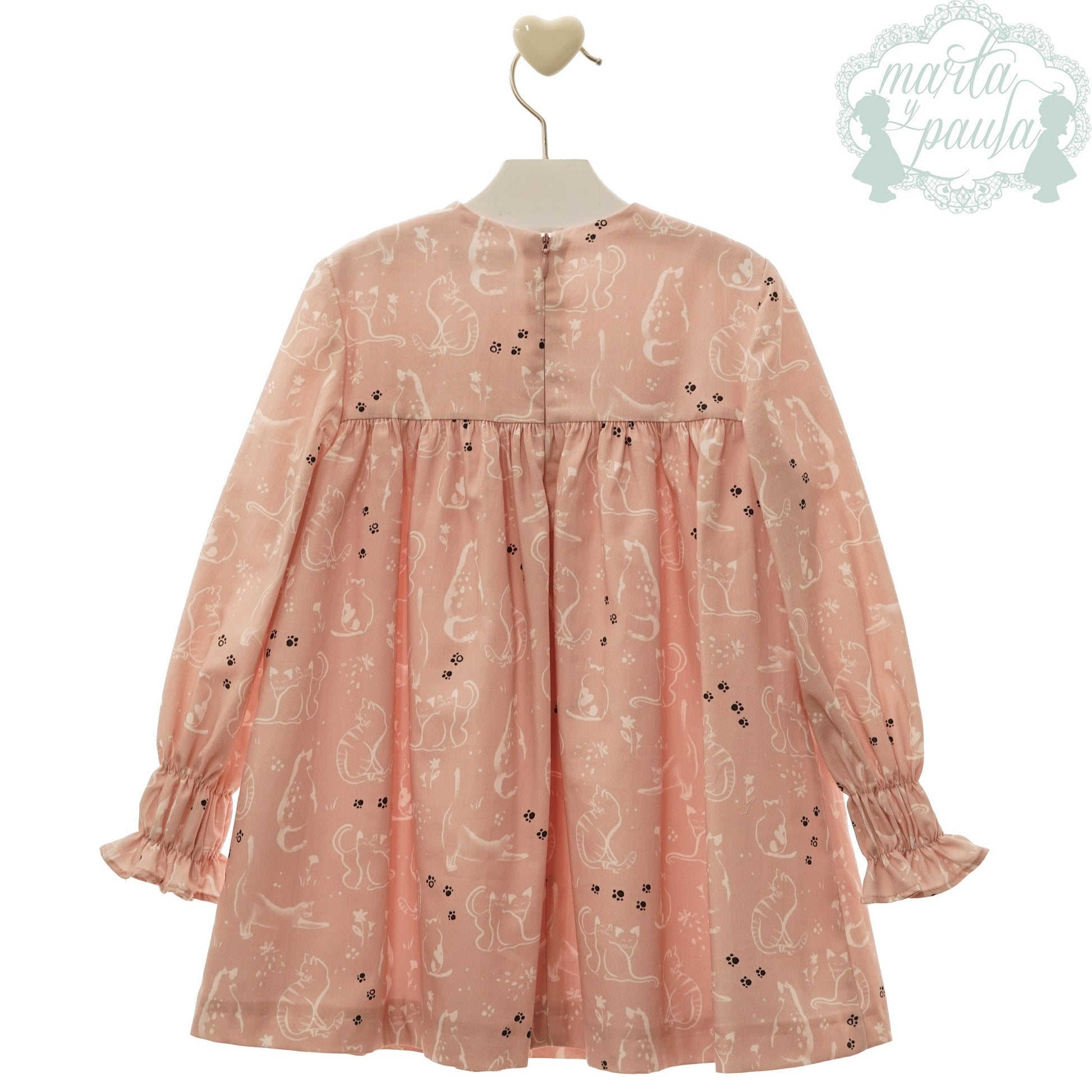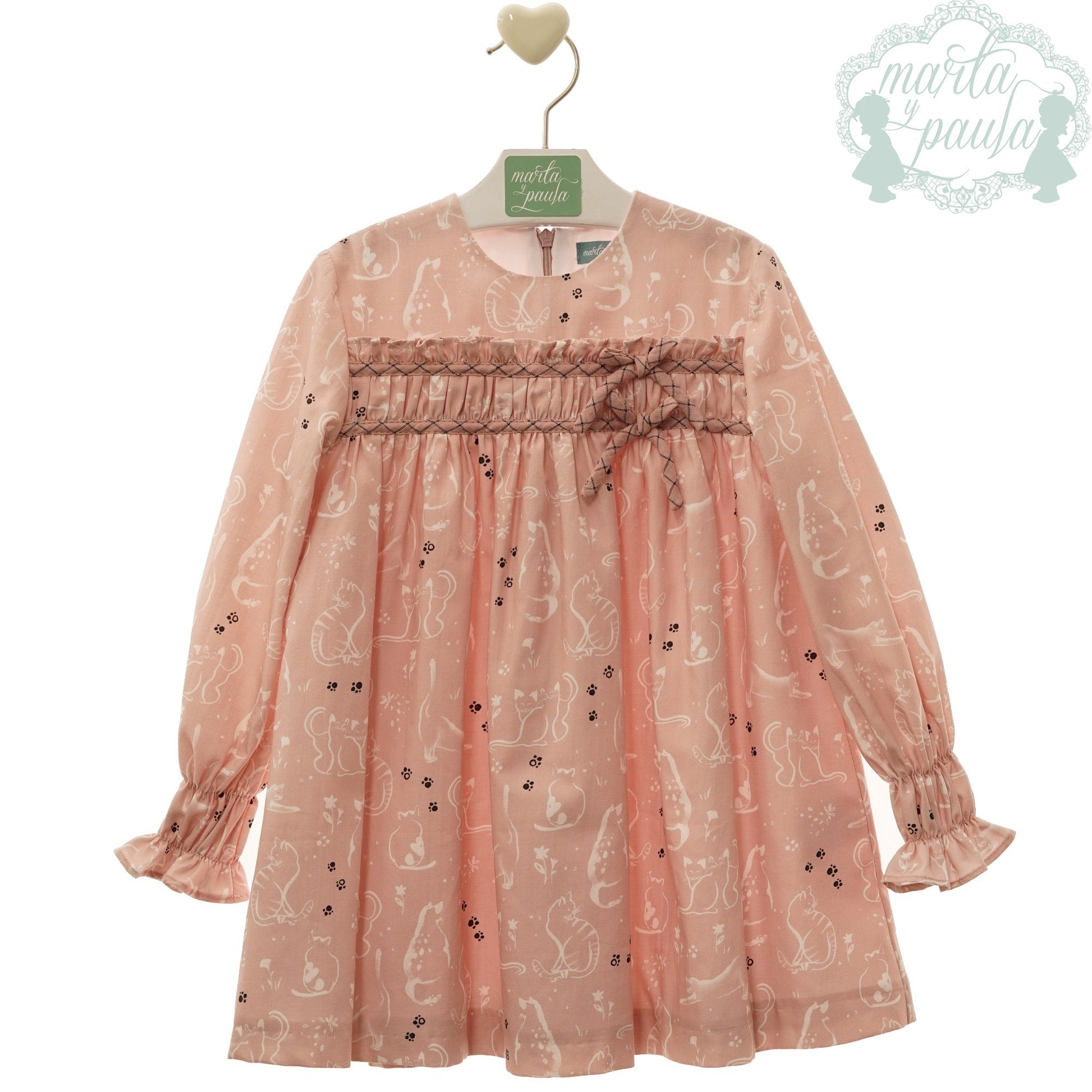 El Vestido Infantil Paolo 5157 de Marta y Paula es una pieza destacada dentro de la colección otoño-invierno, ideal para aportar confort y estilo a las niñas. Presenta un delicado estampado de gatitos en rosa palo que aporta un toque tierno y actual, mientras que sus mangas largas con volantes ofrecen un diseño elegante y práctico para la temporada fría. El lazo ubicado en el pecho añade un detalle sofisticado y femenino. Fabricado en España con materiales de alta calidad, garantiza durabilidad y un acabado cuidadoso, asegurando comodidad y resistencia para el uso diario. Perfecto para ocasiones especiales o el día a día, combina moda y funcionalidad con excelentes terminaciones.