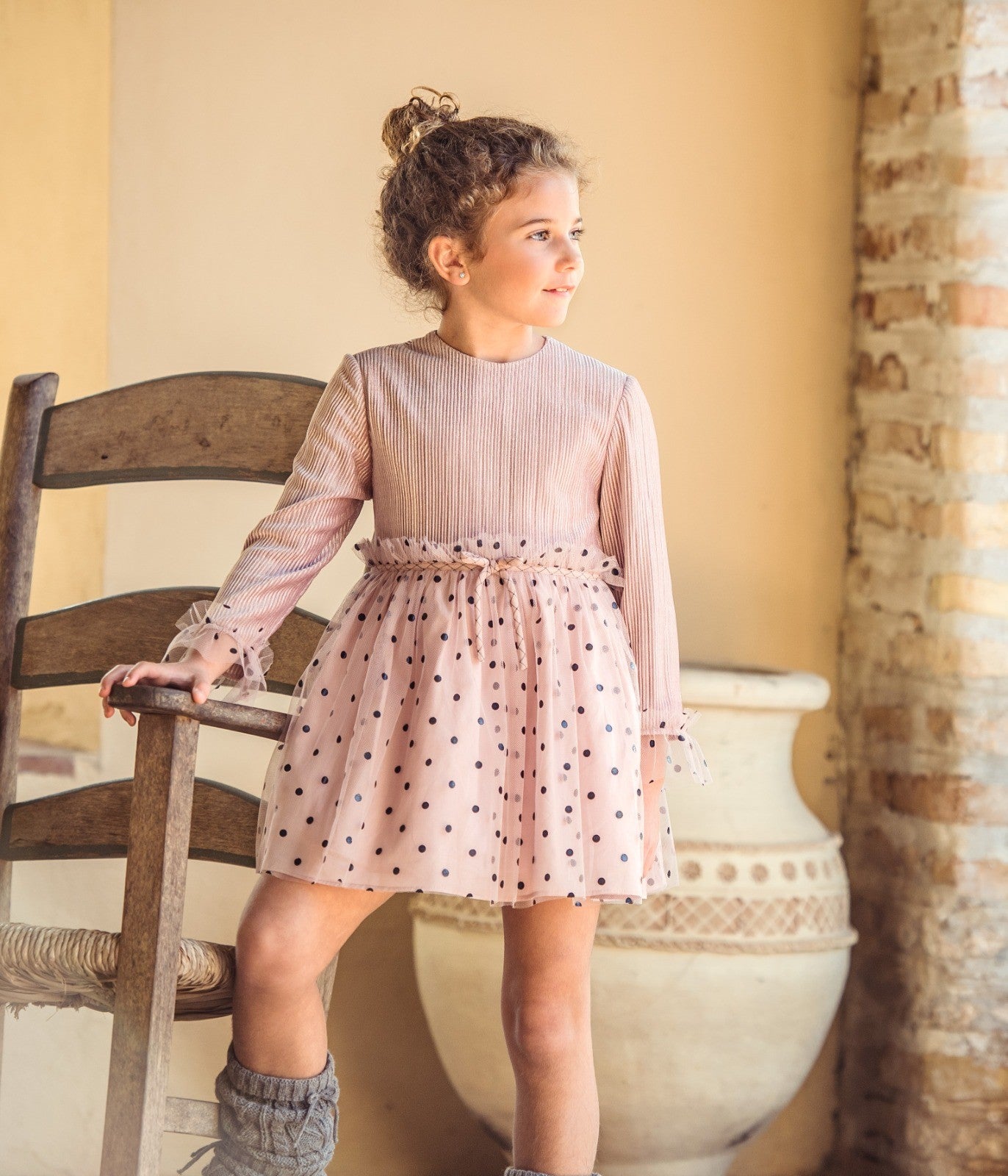 El Vestido Infantil Paolo 5159 de la colección otoño-invierno de Marta y Paula destaca por su delicadeza y elegancia. Confeccionado en terciopelo rosa palo de alta calidad, ofrece un tacto suave y calidez ideal para las temporadas frías. Su diseño incluye manga larga con un volante de tul bordado que aporta un toque sofisticado, adornado con un elegante bodoque en terciopelo negro que resalta el lazo colocado en el pecho. Este vestido, fabricado en España, combina estilo y confort, convirtiéndolo en una opción perfecta para ocasiones especiales de los más pequeños.