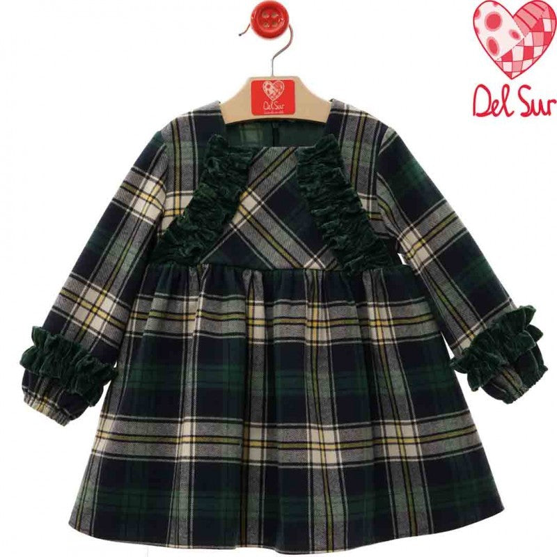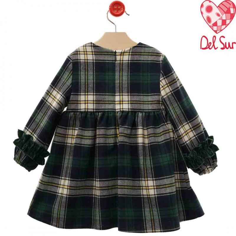 La familia Sabrina de Del Sur presenta este vestido infantil con vuelo, diseñado especialmente para niñas. El vestido destaca por su estampado de cuadros en un elegante tono verde botella y un volante delicado en el pecho que aporta un toque de frescura y movimiento. Cuenta además con un detalle de volante en terciopelo verde tanto en los brazos como en el pecho, que añade textura y sofisticación al diseño. Fabricado en España, este vestido combina tradición y calidad, asegurando comodidad y estilo para ocasiones especiales o uso diario. Ideal para quienes buscan un look infantil con un aire clásico y cuidado.