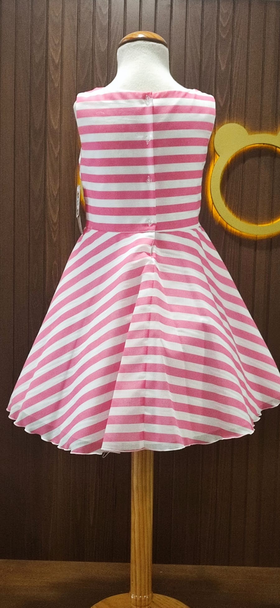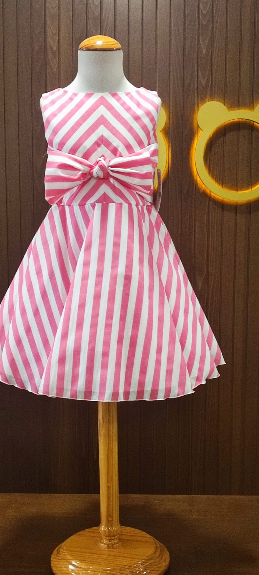 Vestido sin mangas en un estampado de rayas fucsia y blanco. Decorado con un lazo en la cintura en el mismo tejido.