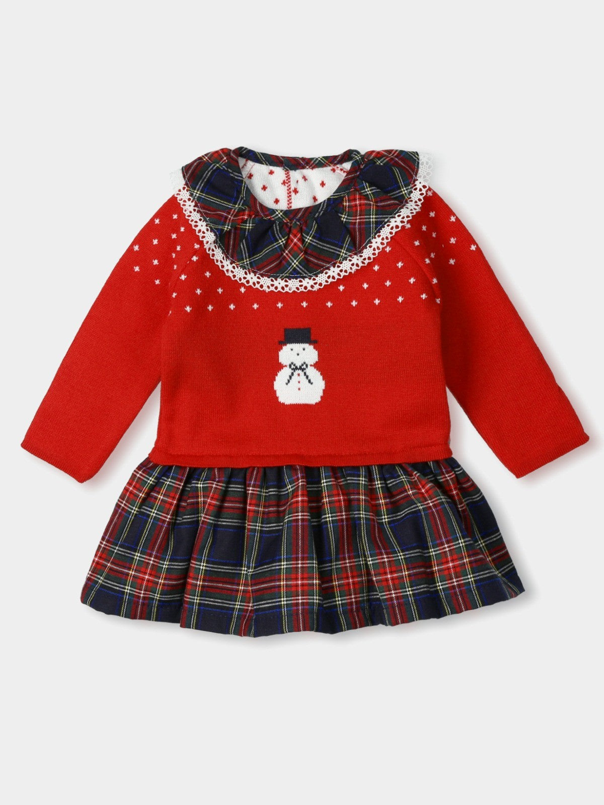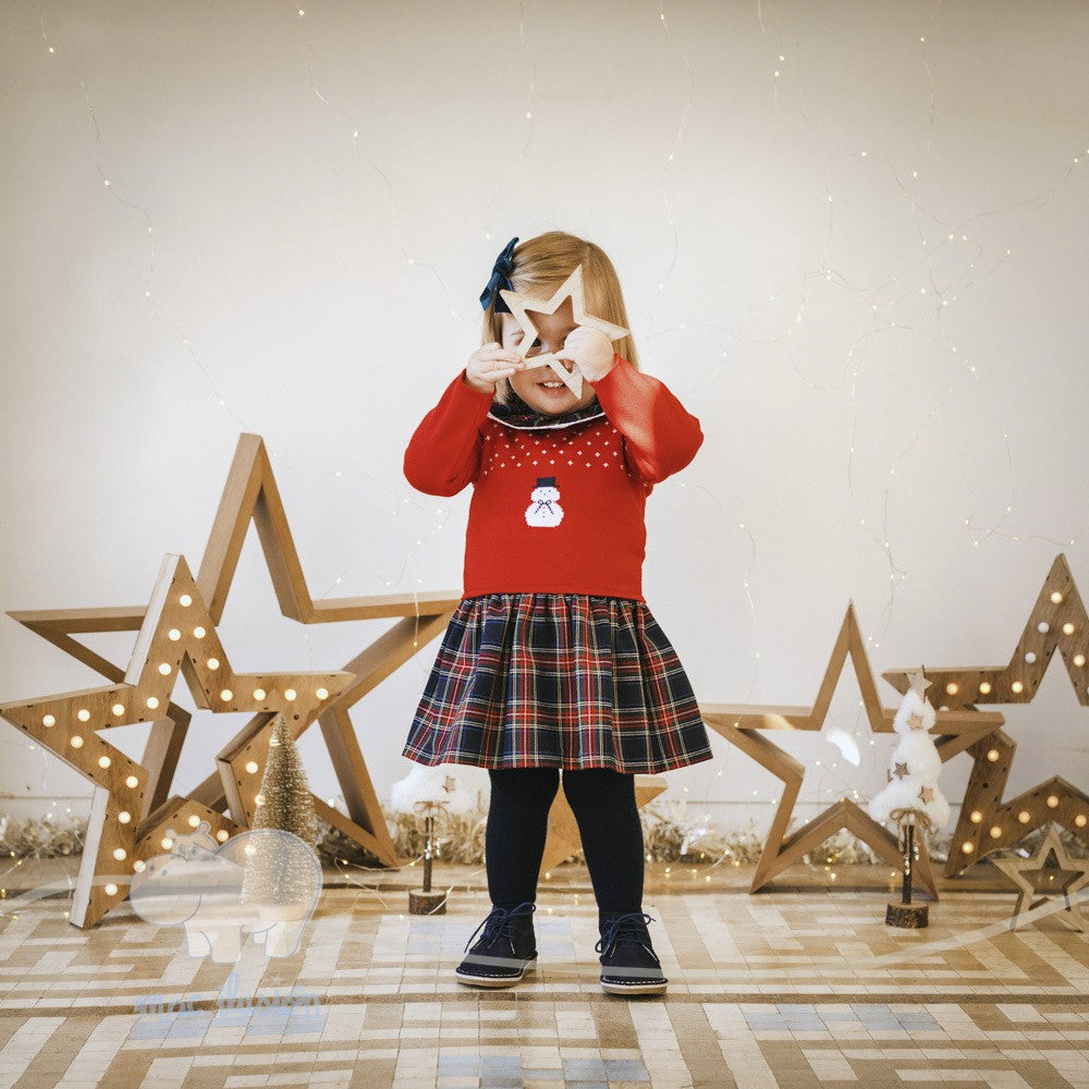 Cuerpo de punto en tono rojo con dibujos navideños y falda estampada en cuadros escoceses.